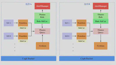 Thanos Query聚合同一组件的所有集群,Thanos Rule通过自研的Sidecar同步组件报警规则,部署独立的AlterManager,独立的Grafana应用。 - 每个组件都有一个 ceph bucket,将历史监控数据存储到