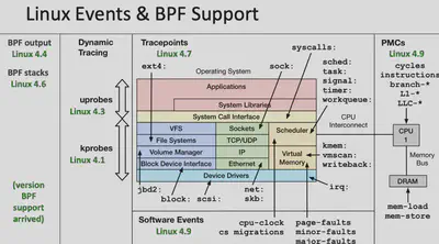 | 内核版本 | Linux 2.1.75(1997 年) | Linux 3.18(2014 年)[4.x for kprobe/uprobe/tracepoint/perf-event] |
