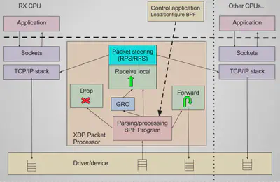 相对于系统的性能分析和观测,eBPF 技术在网络技术中的表现,更是让人眼前一亮,BPF 技术与 XDP(eXpress Data Path)和 TC(Traffic Control)组合可以实现功能更加强大的网络功能,更可为 SDN 软件定义网络提供基础支撑。XDP 只作用与网络包的 Ingress 层面,BPF 钩子位于网络驱动中尽可能早的位置,无需进行原始包的复制就可以实现最佳的数据包处理性能,挂载的 BPF 程序是运行过滤的理想选择,可用于丢弃恶意或非预期的流量、进行 DDOS 攻击保护等场景;而 TC Ingress 比 XDP 技术处于更高层次的位置,BPF 程序在 L3 层之前运行,可以访问到与数据包相关的大部分元数据,是本地节点处理的理想的地方,可以用于流量监控或者 L3/L4 的端点策略控制,同时配合 TC egress 则可实现对于容器环境下更高维度和级别的网络结构。