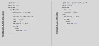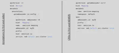 Ambassador 不同版本之间配置方式的变更如下图所示,configmap 方式是早期使用方式,目前已经被废弃了,现在更推荐使用 CRD 方式。