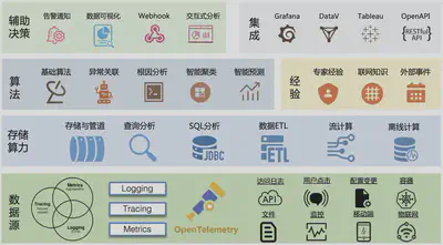 目前我们 SLS 正在开展云原生可观测性的工作,基于 OpenTelemetry 这个未来云原生下可观测性的标准,实现各类可观测性数据的统一收集,覆盖各个数据源和各类数据类型,做到多语言支持、多设备支持、类型统一;向上我们会提供能够支持各类可观测性数据的统一存储和计算能力,支持 PB 级存储、ETL、流计算、百亿级数据秒级分析,为上层算法提供强大的算力支撑;IT 系统的问题非常复杂,尤其涉及到不同的场景和架构,因此我们把算法和经验结合起来进行异常的分析,算法包括基础的统计学、逻辑性算法,也包括 AIOp 相关的算法,经验中包括人工输入的专家知识、网上上积累的各类问题解决方案以及外部产生的一些事件;最上层我们会提供一些辅助决策的功能,例如告警通知、数据可视化、Webhook 等,此外会提供丰富的外部集成能力,例如对接三方的可视化 / 分析 / 告警系统,提供 OpenAPI 以便不同的应用方集成。
