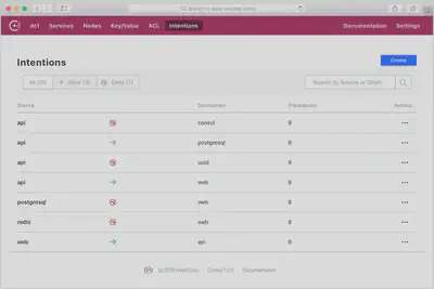 服务之间的访问控制通过“intentions”进行配置。一个意向(intention)是一条从源到目的服务的允许或拦截规则。Intentions 可以通过 UI 界面、命令行、API 或 Terraform 进行创建。
