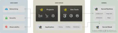 eBPF 从根本上改变了这个现象。通过在操作系统内运行受沙盒保护的程序,应用开发人员可以在运行时运行 eBPF 程序,为操作系统添加额外的功能。操作系统会利用即时编译器和验证引擎的帮助来保证安全性和执行效率,就像本地编译一样。这导致了一系列基于 eBPF 的项目的涌现,涵盖了各种用例,包括下一代网络、可观测性和安全功能。