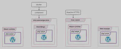 当它以独立的 Wasm 应用程序运行时,PHP 将为 WordPress 提供服务。同样地,它也可以在 Docker+Wasm 容器中运行。它还可以在嵌入 Wasm 运行时的任何应用程序中运行。在我们的示例中,这是 apache httpd,它通过 mod_wasm 可以将 Wasm 应用程序用作内容处理程序。最后,PHP.wasm 也可以在浏览器中运行。