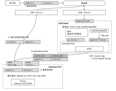 作为四层负载均衡的转发目标,七层 API 网关需要配合完成隧道技术的配置。因为四层负载均衡基于 IP Tunnel 配置转发规则,当它转发数据时,是以 IP Over IP 协议发送的数据包,作为目标,Envoy Pod 在接收到请求以后,需要将 IPIP 包拆解。这需要在 Enovy Pod 中创建类型为 IPIP 的设备并绑定虚拟 IP 地址。