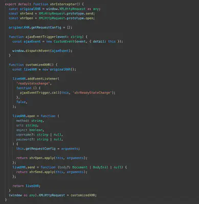 如你所见,它创建了一个 Promise 和一个新的 XMLHttpRequest 对象。由于 fetch 的代码是内置在浏览器中的,它必须先监控代码执行。因此,当我们添加监听事件时,我们无法监控 fetch 中的代码。只是在监控完代码执行后,我们重写一下 fetch: import {fetch} from 'whatwg-fetch'; window.fetch = fetch; 这样,我们就可以通过上面的方法拦截 fetch 请求了。