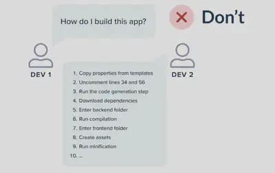 理想情况下,项目的简单构建应为单个命令。该命令通常调用构建系统或脚本(例如 Bash、PowerShell),该系统或脚本负责获取源代码、运行基本测试并打包最终构件/容器。
