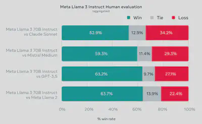 进入 Llama 3:Meta 对这些挑战和社区的反馈做出了回应。通过 Llama 3,Meta 设定了与当今市场上顶级专有模型相媲美的最佳开源模型的目标,同时也优先考虑了负责任的开发和部署实践。