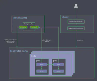 - istioctl 解析指令(create、delete 等),通过 k8s REST 接口,将变更推送的 k8s。
