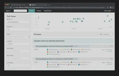 下面看到的是一个 Jaeger UI 追踪视图。在其中有一系列由hey生成的追踪数据,hey 是一个流行的负载生成器和基准测试工具,是 Apache Bench(ab)的一个有价值的替代品。与 ab 不同的是 hey 支持 HTTP/2。在前一篇文章中详细介绍了 hey 的用法。
