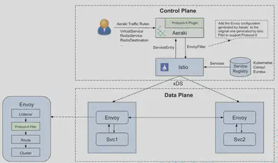 - Aeraki 作为一个独立组件部署在 Mesh 的控制面,可以很方便地作为一个插件和 Istio 进行集成,对 Istio 的流量管理能力进行扩展。