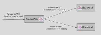 我们来看一下如何才能够在 Istio 中实现 AwesomeRPC 协议的流量管理,例如根据请求 header 中的 user name 字段将来自 ProductPage 的请求路由到不同版本的 Reviews 中,以实现一个灰度发布的场景。
