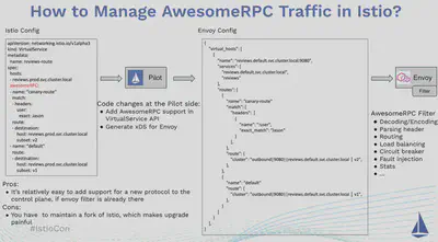 我们想到的最显而易见的方式就是直接修改 Istio 代码。首先我们需要在 Istio 的 VirtualService CRD 中支持 AwesomeRPC 协议。增强后的 VirtualService CRD 如下图中最左的规则配置所示。AwesomeRPC 和 HTTP 路由的语义类似,都是根据 Header 中某些属性的值进行路由。因此我们只需要将 HTTP 协议类型改为 AwesomeRPC,可以直接采用 VirtualService 中的 HTTPRoute 结构来表示 AwesomeRPC 的路由规则。然后我们需要在 Pilot 代码中根据 AwesomeRPC 的服务定义和 VirtualService 定义的路由规则生成 Envoy 所需的真实配置,并通过 xDS 下发给数据面的 Envoy。当然,以上的前提是我们已经通过 Envoy 的 Filter 扩展机制编写了 AwesomeRPC 的 Filter 插件,实现 AwesomeRPC 的编解码,Header 解析,动态路由等数据面所需的功能。