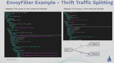 下面我们来看一个采用 Thrift 协议的真实案例。Thrift 是 Apache 基金会下一个轻量级、支持多语言的开源 RPC 框架。Envoy 中已经支持 Thrift,但 Istio 中只对 Thrift 提供了有限的支持,并不能实现 Traffic Splitting 等高级流量管理功能。如果我们希望在 Istio 中提供下图中右下角所示 Thrift 服务的 Traffic Splitting 流量控制,我们可以通过 EnvoyFilter 来实现。