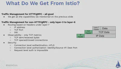 然而在 Istio 中,对于除了 HTTP 和 gRPC 之外的协议,我们只能在 OSI 三到六层对这些协议进行处理。这意味着我们只能基于三层的 IP 地址,四层的 TCP 端口或者六层的 SNI(Server Name Indication)对这些协议进行路由。只能收集到 TCP 层面的指标,例如 TCP 收发包数量或者打开/关闭的 TCP 链接数量。只能采用 mTLS 进行链路层面的认证和权限控制。换而言之,对于这些协议,我们依然需要在应用代码中处理流量控制、可观测性、安全认证这些本应该由 Service Mesh 基础设施来统一处理的共性问题。这违背了我们将微服务迁移到 Service Mesh 的初衷:将微服务通信和治理的共性问题从应用代码下沉到 Service Mesh 基础设施层。