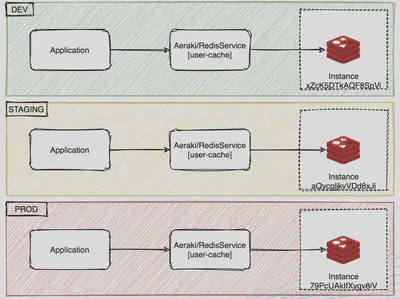 我们在开发、测试和生产环境中通常需要访问不同的后端资源,例如需要连接到不同的 Redis 缓存或者不同的 MySQL 数据库。一般来说,我们需要修改随应用程序发布的配置文件中的后端资源地址,以达到在不同环境中切换后端资源的目的。通过 Aeraki 的帮助,我们可以用 Service Mesh 来屏蔽不同后端资源的配置差异,使得应用程序可以用相同的方式访问不同环境中的后端资源。