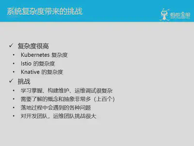 当然,knative 体系的复杂度问题是无法回避的:kubernetes,istio,knative 三者都是复杂度很高的产品,加在一起整体复杂度就非常可观了,挑战非常大。