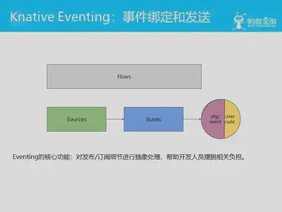 Knative Eventing 组件负责事件绑定和发送,同样提供多个抽象概念:Flow,Source,Bus,以帮助开发人员摆脱概念太多的负担(关于这一点,我保留意见)。