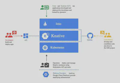 Knative 构建在 Kubernetes 和Istio之上,它的设计考虑到了多种角色通过该框架进行交互,包括开发人员、运维人员和平台提供者。