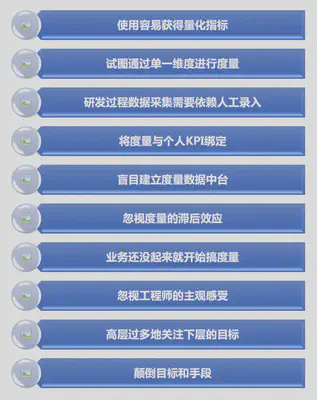 比较理想的做法应该是通过对研发过程的深度洞察,发现有待改定的点,然后寻找能够证实自己观点的度量集合并采取相应的措施,最后再通过度量数据来证实措施的实际价值,这种“精准捕捞”的策略往往更具实用价值。