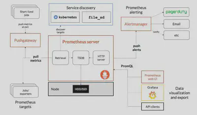 这种就是 prometheus 的定义的 metrics 格式规范,缺省是在 http(s) 的 url 的/metrics 输出。 而 metrics 要么程序定义输出 (模块或者自定义开发),要么用官方的各种 exporter(node-exporter,mysqld-exporter,memcached_exporter…) 采集要监控的信息占用一个 web 端口然后输出成 metrics 格式的信息,prometheus server 去收集各个 target 的 metrics 存储起来 (tsdb)。 用户可以在 prometheus 的 http 页面上用 promQL(prometheus 的查询语言) 或者 (grafana 数据来源就是用)api 去查询一些信息,也可以利用 pushgateway 去统一采集然后 prometheus 从 pushgateway 采集 (所以 pushgateway 类似于 zabbix 的 proxy),prometheus 的工作架构如下图: