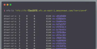 在内部网络中,我们发现了 6 个 AWS Elastic File System(EFS)实例,监听端口 2049。EFS 实例的一个常见问题是它们默认配置为公共的——这意味着只要您可以访问其 NFS 端口,就不需要凭据即可查看或编辑文件。这些实例也不例外,我们使用简单的开源 NFS 工具,可以自由访问共享的内容。