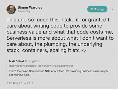 Serverless 的工具支持将会越来越好,但至少目前,仍然远远落后于容器。在容器领域工作的人面临的挑战是抵制修补和追求简单的冲动。