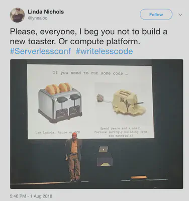 构建基于容器的通用计算平台需要大量的工程专业知识和投资,该平台与 AWS Lambda 等 Serverless 产品一样高效,可扩展且具有弹性。大多数组织根本没有能力解决这个问题。尽管有大量的时间和金钱投入,但我知道一些大企业在他们的尝试中惨遭失败。