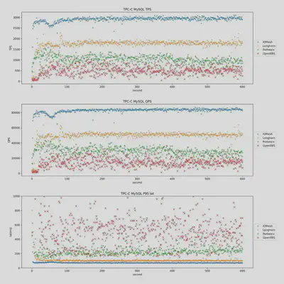 在测试中,我们采用最常见的 MySQL 数据库作为有状态应用,并使用 sysbench-tpcc 模拟业务负载。下表提供了四个云原生存储系统在 TPC-C MySQL 测试中的 TPS、QPS 以及 P95 延迟数据。