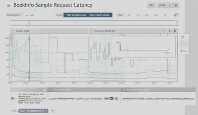 尽管如此,让我们看看在执行过程中是什么样子的。我安装了 Google Kubernetes Engine,使用 Circonus 加载了 Istio 的开发版本,并部署了于 Istio 一起提供的 BookInfo 示例应用程序。下图是从请求到应用程序的请求持续时间分布的热图。你会注意到高亮显示的时间片段的直方图覆盖。我添加了一个覆盖,添加了一个中位数、第九十和百分位的响应时间;在任意的分位数和时间窗上生成这些数据是有可能的,因为我们将原始的数据存储为对数线性直方图。注意,中位数和第九十百分位数是相对固定的,而第九十五百分位数倾向于在几百毫秒的范围内波动。这种类型的深度可观察性可以用来量化 Istio 本身在版本上的表现,因为 Istio 的开发正在快速迭代。或者,更可能的是,它将用来标识部署的应用程序中的问题。如果你的百分位数不符合你的内部服务水平目标 (SLO) ,这是一个很好的标识,说明你有事情需要做了。毕竟,如果有 20 个用户中有一个在你的应用程序上有低于标准的体验,难道你不想知道吗?