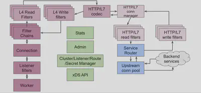 L4 filter主要包括:HTTP connection manager, MySQL proxy, Rate limit, RBAC, Redis proxy, TCP proxy 等。L7 filter是 L4 filter 中HTTP connection manager下面定义的 filter, 主要包括:CORS, External Authorization, Fault Injection, Health check, JWT Authentication, Lua, Rate limit, Router 等。无论 L4 还是 L7 的 filter 都是按照指定的次序执行,istio 中使用的 istio-proxy 也是在 envoy 的基础上额外编译进了 istio_authn,mixer 等 filter,以实现 istio 中的 policy 和 telemetry 等功能。