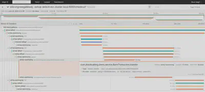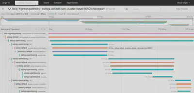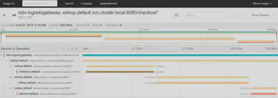 Jaeger 用图形直观地展示了这次调用的详细信息,可以看到客户端请求从 Ingressgateway 进入到系统中,然后调用了 eshop 微服务的 checkout 接口,checkout 调用有三个 child span,分别对应到 inventory,billing 和 delivery 三个微服务的 REST 接口。