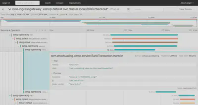 Istio/Envoy为微服务提供了开箱即用的分布式调用跟踪功能。在安装了Istio和Envoy的微服务系统中,Envoy会拦截服务的入向和出向请求,为微服务的每个调用请求自动生成调用跟踪数据。通过在服务网格中接入一个分布式跟踪的后端系统,例如zipkin或者Jaeger,就可以查看一个分布式请求的详细内容,例如该请求经过了哪些服务,调用了哪个REST接口,每个REST接口所花费的时间等。