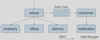 如下图所示,demo 程序中增加了发送和接收 Kafka 消息的代码。eshop 微服务在调用 inventory,billing,delivery 服务后,发送了一个 kafka 消息通知,consumer 接收到通知后调用 notification 服务的 REST 接口向用户发送购买成功的邮件通知。