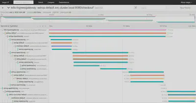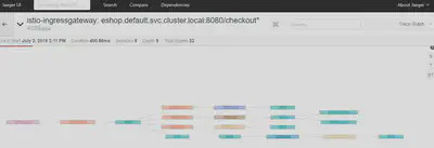 在浏览器中打开地址:http://${NODE_IP}:31380/checkout,以触发调用 eshop 示例程序的 REST 接口。然后打开 Jaeger 的界面 http://${NODE_IP}:30088 查看生成的分布式调用跟踪信息。