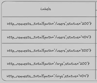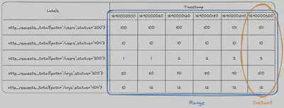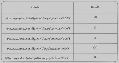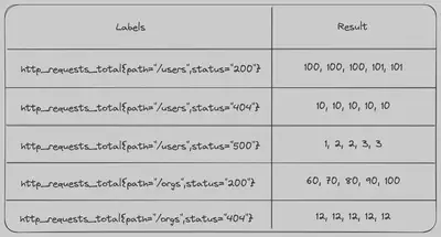 在我们的示例表中,我们有带有path和status标签的计数器http_requests_total。对于每个path和status的组合,我们为每个时间戳存储一个计数器值。
