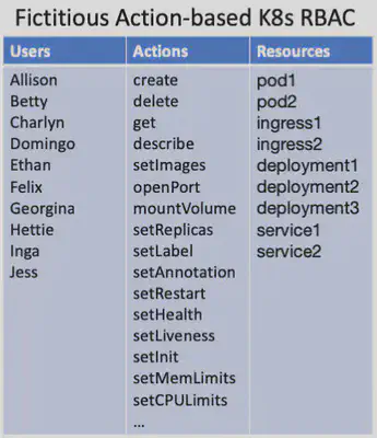 一种方案是将一堆关于 Kubernetes 资源的知识构建到访问控制系统本身。然后管理员可以写一个策略,比如谁可以 update-labels,permitted-image-registries 是什么,等等。这就是大多数系统的做法 —— 发明一堆权限,然后在上面建立一个自定义的访问控制系统。